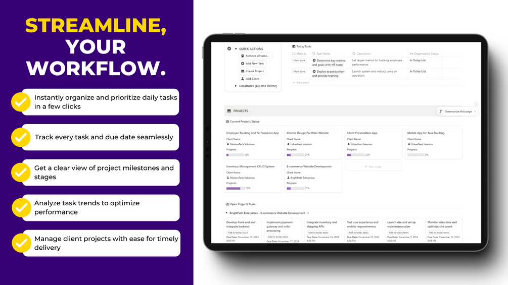 Manage client projects with laser focus. This template helps you organize, prioritize, and tackle today’s tasks in seconds.