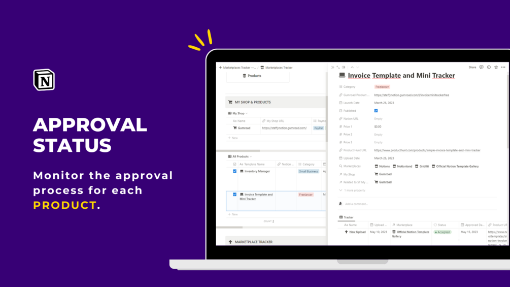 Marketplace Tracker gives you control over your Notion template business. Simplify your workflow, improve your productivity, and achieve success in the world of templates.